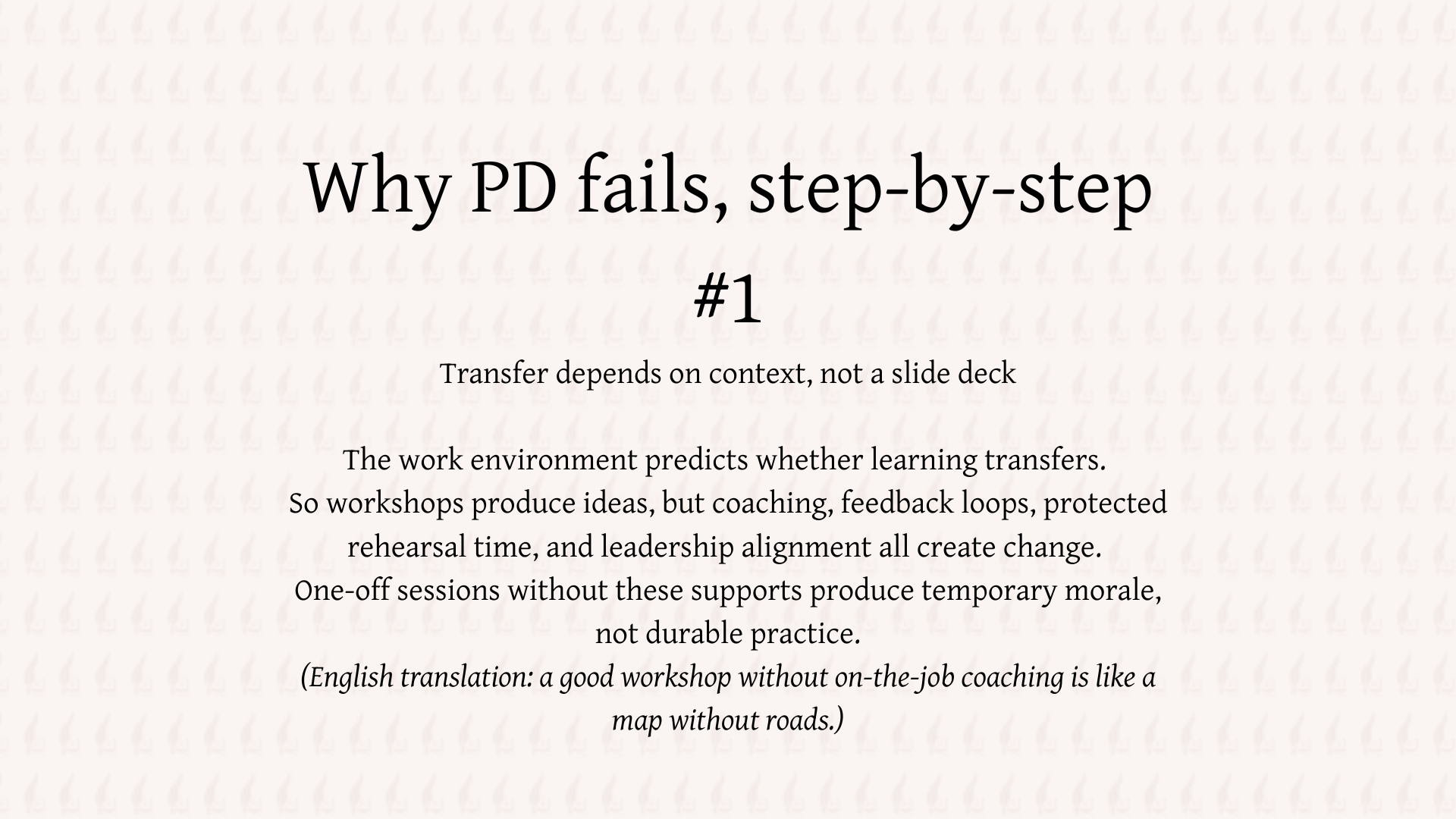 One-off PD rarely transfers into classroom practice; transfer depends on workplace supports (coaching, leadership, feedback).