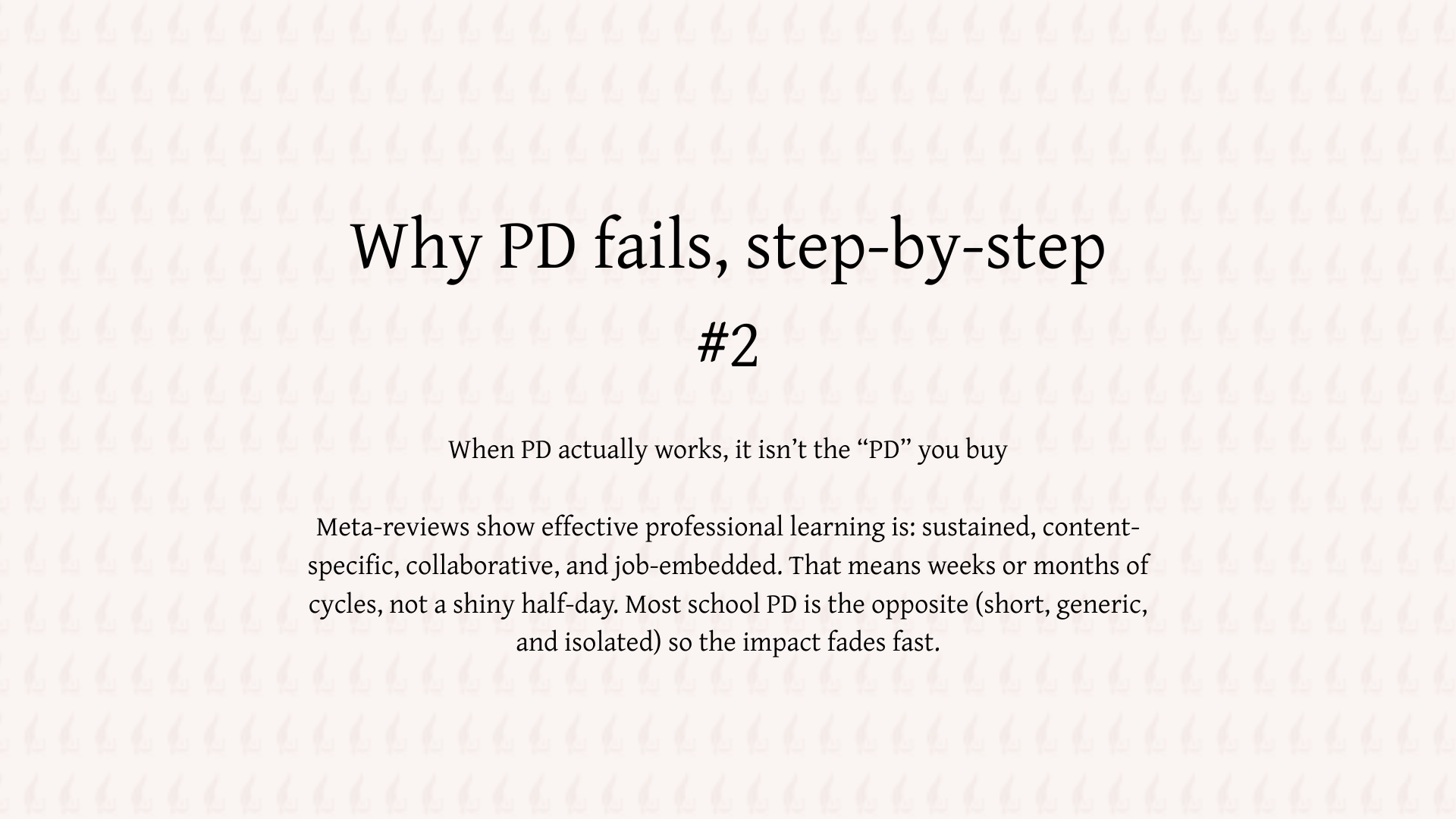 Effective PD is sustained, content-focused, collaborative, and iterative (NOT a single afternoon).