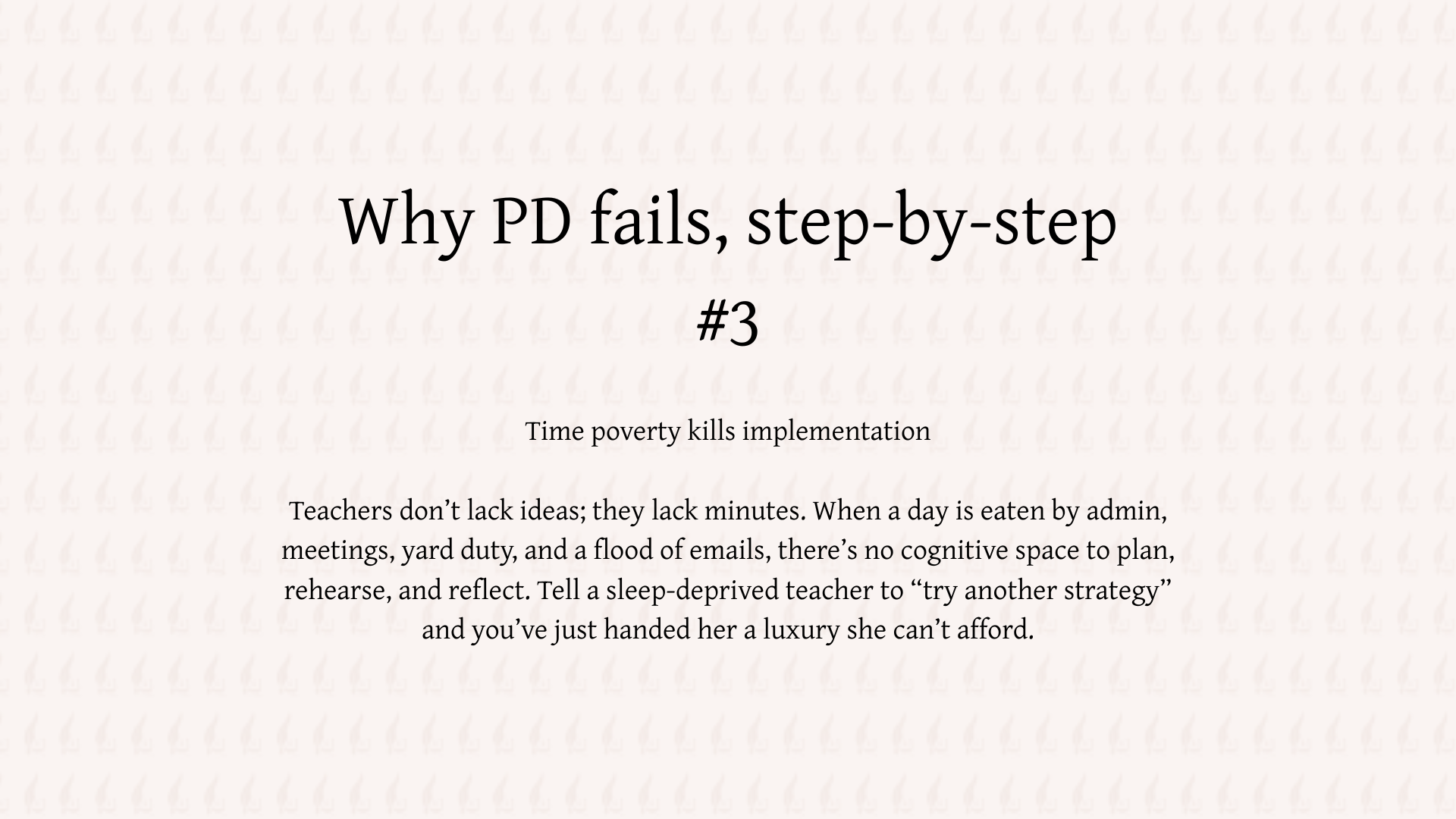 Teachers are chronically time-poor; you cannot PD your way out of structural time poverty.