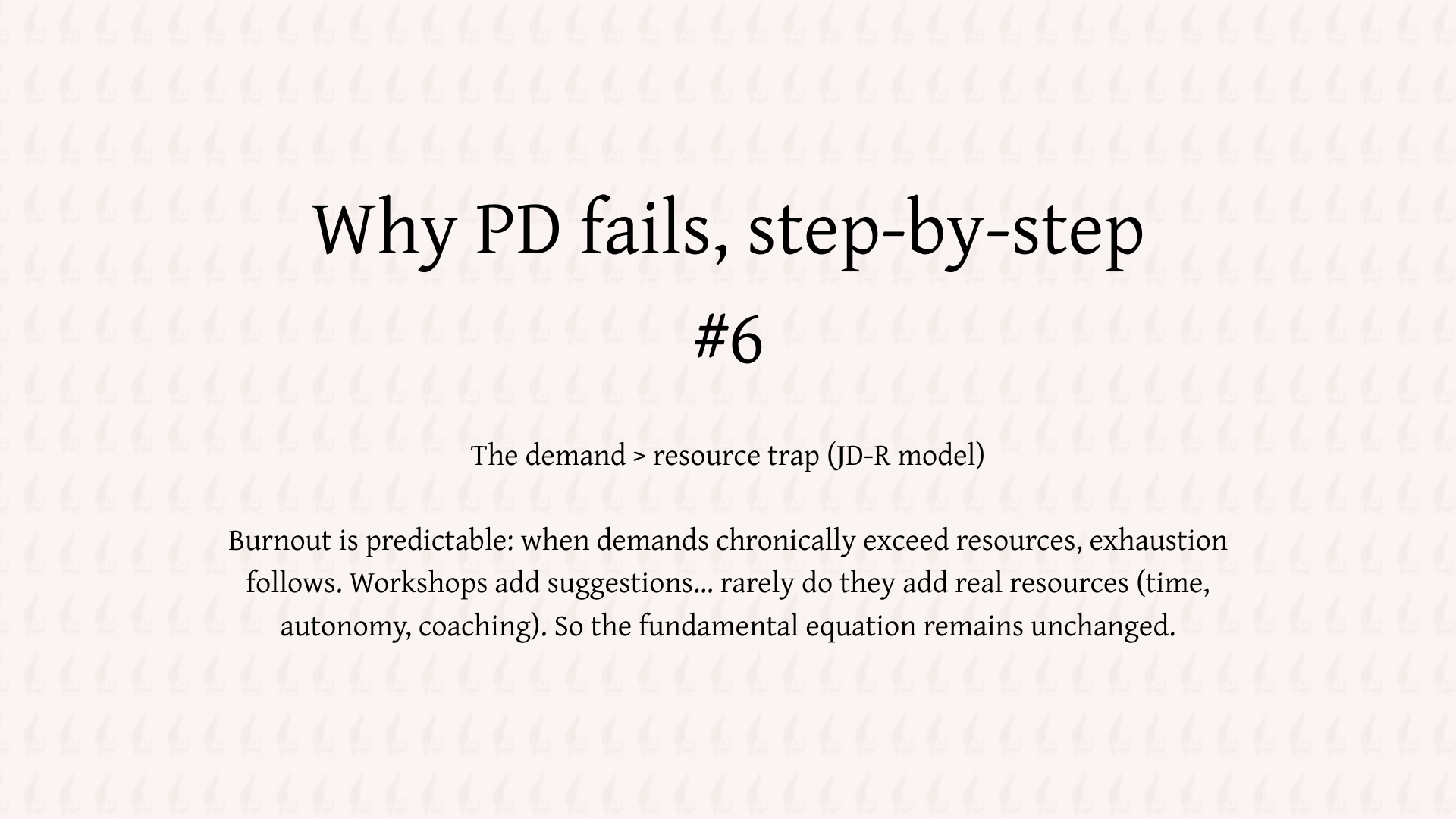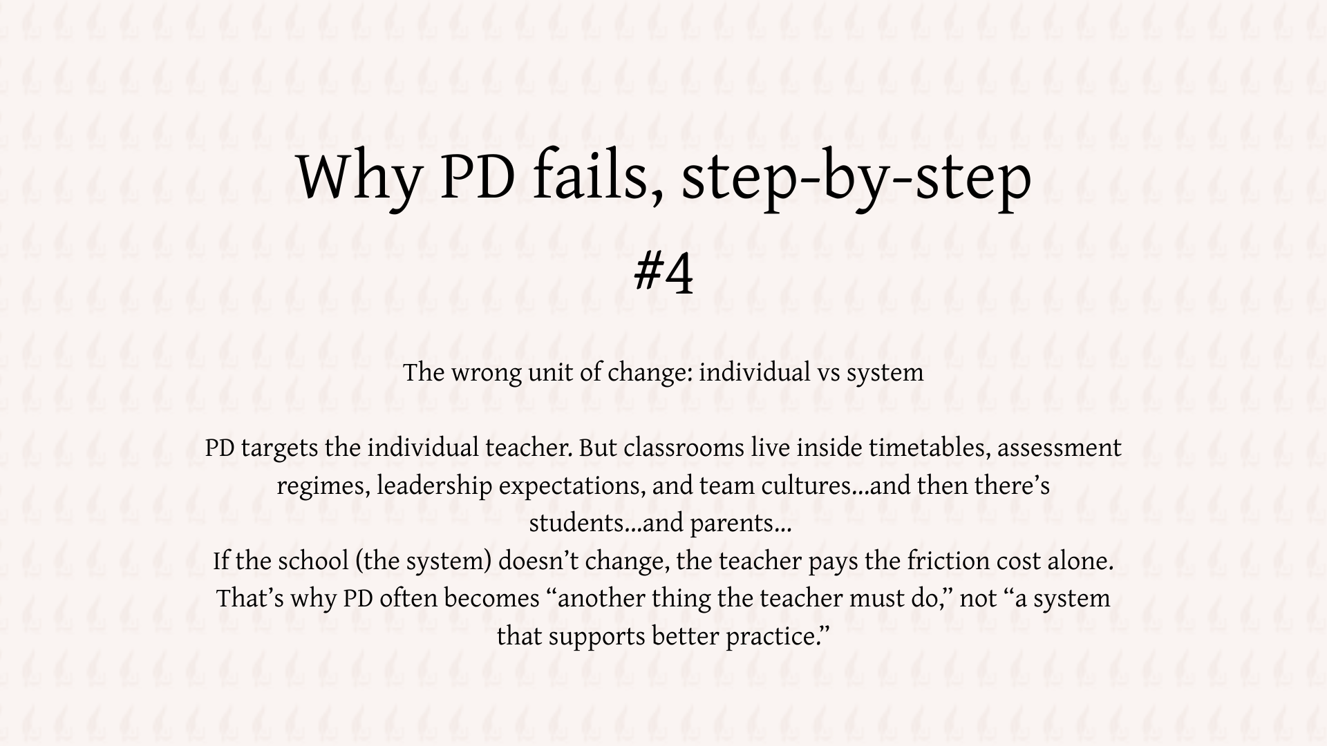 On paper PD is tidy and logical: you have a problem in the classroom → we give you training → you fix it. Struggling with behaviour? PD. Want more engaging lessons? PD. Feeling drained? PD. The message is simple and seductive: learn more, do better, feel better.