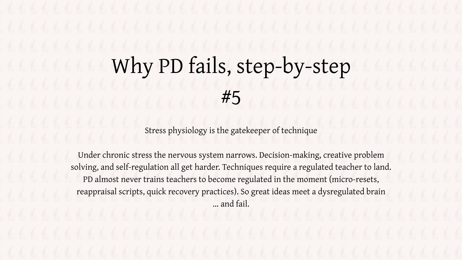 If the culture, timetable, and supports stay the same, PD hands you a prettier binder and a heavier heart. Strategies don’t fail because teachers are lazy or incompetent.